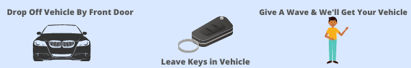 We request that all vehicles be dropped off outside our front door under the awning, so that we may be aware of your arrival and see you both. Please leave the keys in the car, give us a wave, and we will retrieve the vehicle upon your departure.